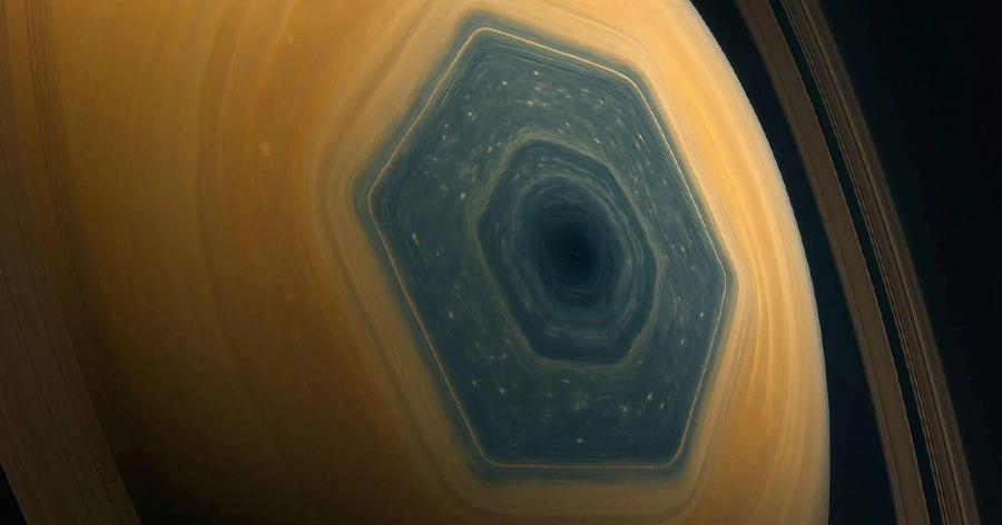 Um gigantesco hexágono, visível no polo norte de Saturno, continua a desafiar explicações completas da ciência. Descoberto pela sonda Voyager na década de 1980, o
